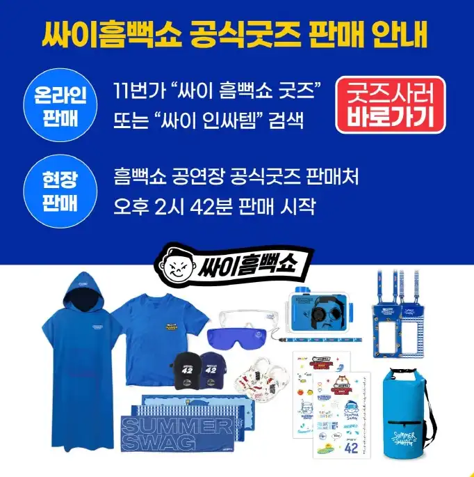 싸이 흠뻑쇼 공식 굿즈 판매는 11번가 "싸이 흠뻑쇼 굿즈" 또는 "싸이 인싸템" 검색하시면 되고 아래 바로가기 버튼 클릭하시면 바로 이동됩니다.