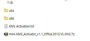 mini-KMS_Activator_v1.1_Office.2010.VL.ENG.7z파일은 정품 인증을 위해 필요한 크랙파일로 7z으로 압축되어 있습니다. 압축해제 해서 사용하시면 되고 KMS Activation.txt 파일은 크랙 프로그램 설명서입니다.