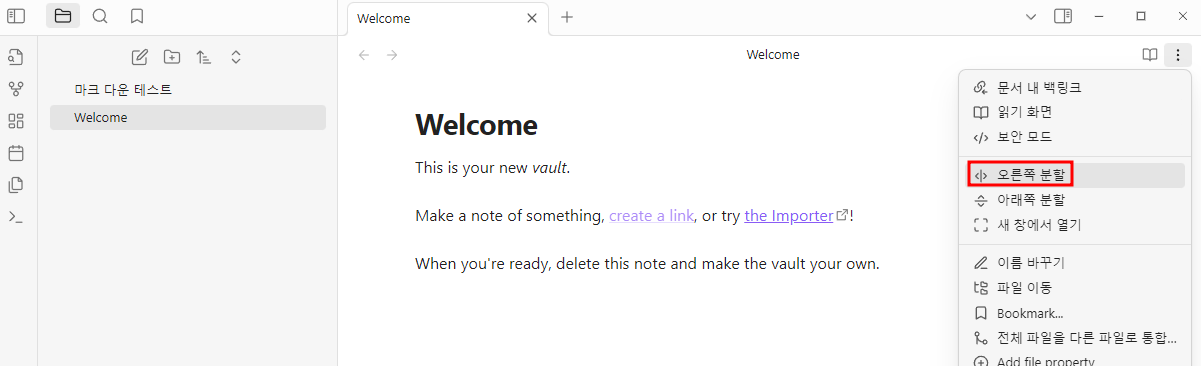 우선 마크 다운을 알아가는 과정을 편하게 하기 위해서 옵시디언 창을 두 개로 나눠 주겠습니다. 두 개로 나누는 이유는 마크 다운 형식을 바로바로 적용되는 모습을 확인하기 위해서인데 귀찮으시다면 하지 않으셔도 됩니다.