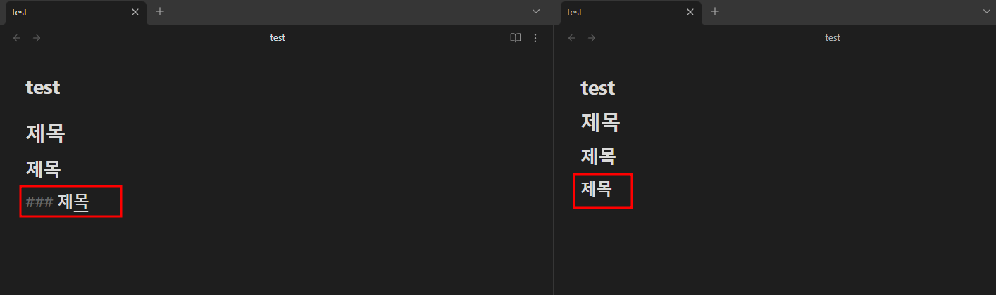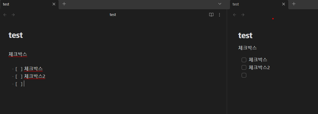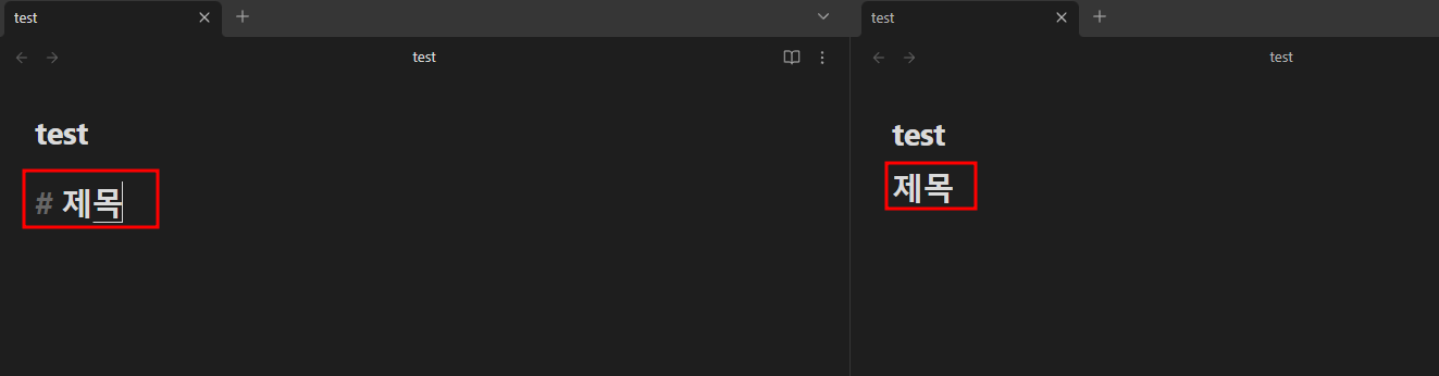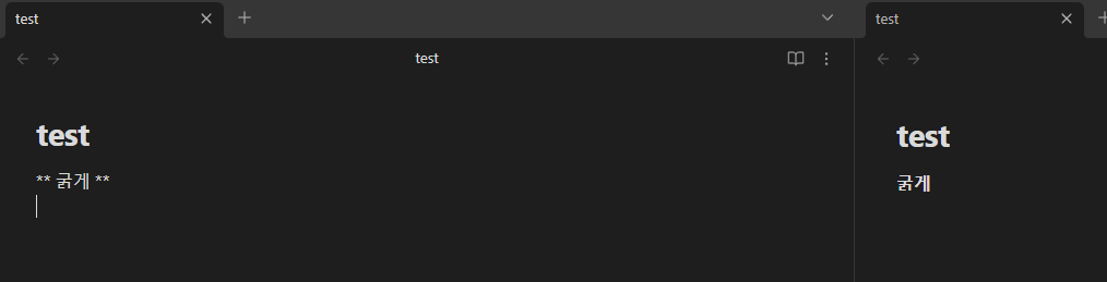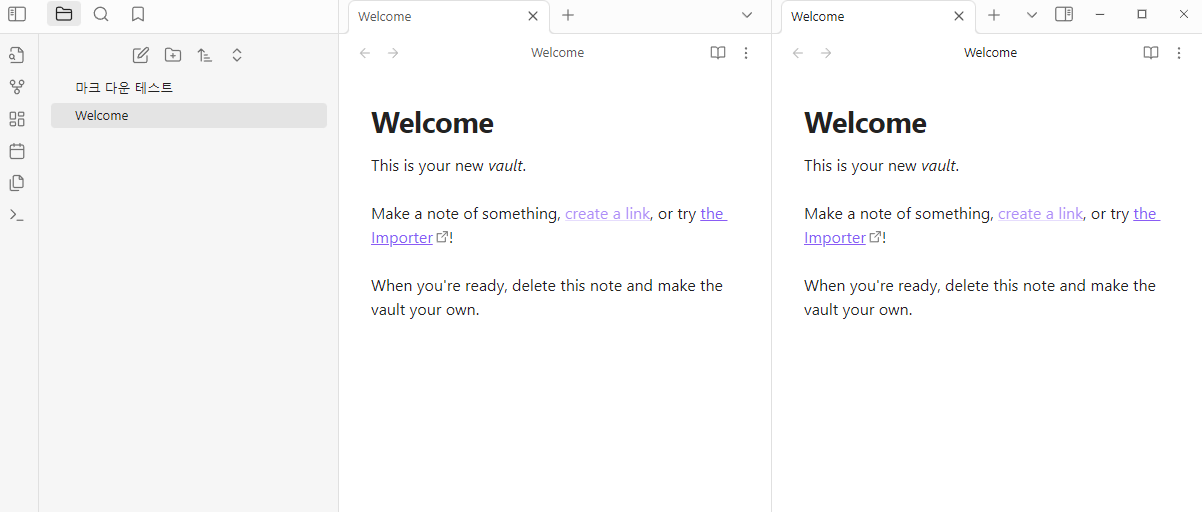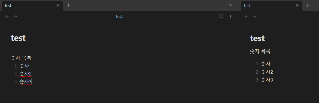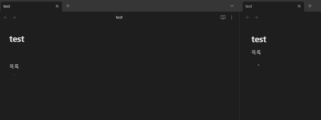 우선 마크 다운을 알아가는 과정을 편하게 하기 위해서 옵시디언 창을 두 개로 나눠 주겠습니다. 두 개로 나누는 이유는 마크 다운 형식을 바로바로 적용되는 모습을 확인하기 위해서인데 귀찮으시다면 하지 않으셔도 됩니다.