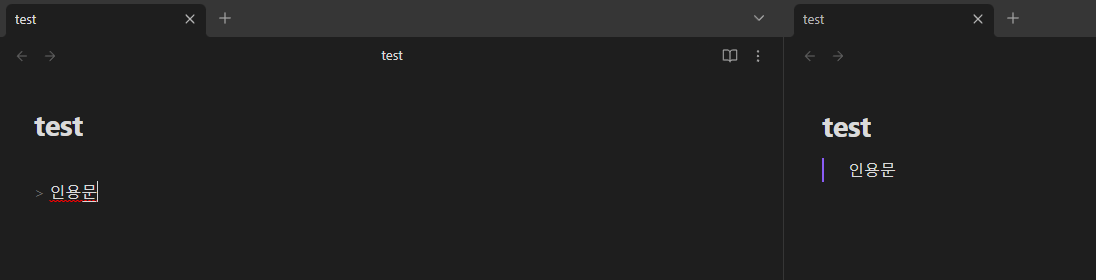인용문을 나타나게 하기 위해서는 > 기호를 사용합니다. 이는 다른 저자의 말이나 중요한 메시지를 돋보이게 하는 데 쓰일 수 있습니다. 지금은 오른쪽에 보라색 줄로 따로 설정을 해서 변경해 줄 수 있습니다.