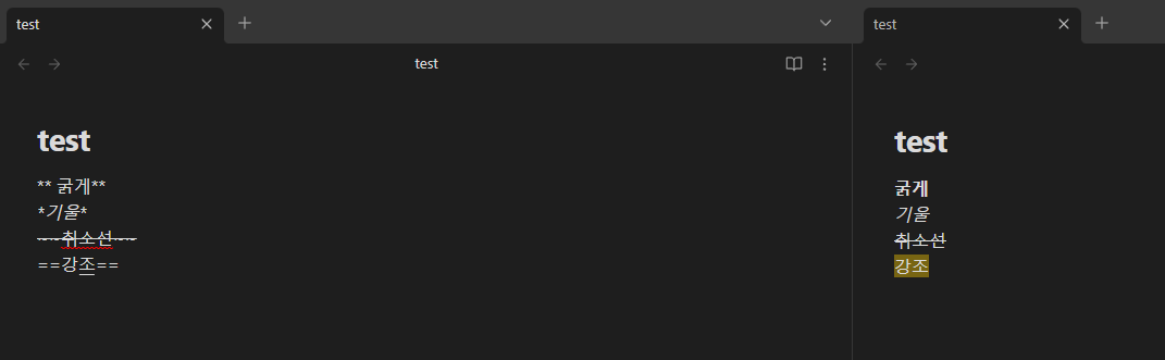 텍스트를 강조하기 위한 방법으로는 **굵게**, *기울임*, ~~취소선~~ == 강조== 등을 사용할 수 있습니다. 한번 사용해 보도록 하겠습니다.