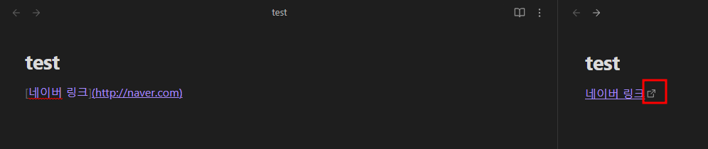 링크를 삽입하는 기호는 [링크 텍스트](URL) 형식입니다. 아래 이미지 형식대로 입력해 주시면 되는데 오른쪽 네모박스에 화살표 표시가 생겼다면 링크가 정상적으로 생겼다는 뜻입니다. 저 링크를 클릭하면 네이버로 이동되는 것이 확인됩니다.