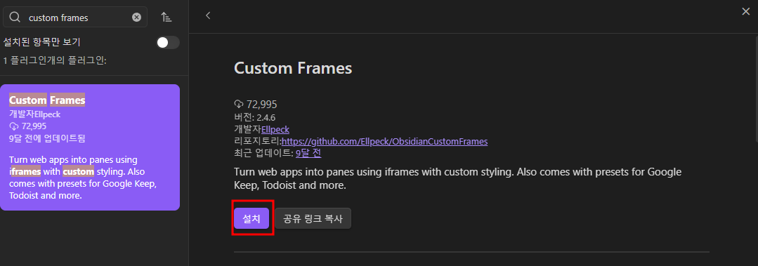 옵시디언에는 플러그인이라는 옵시디언 기능을 확장하고 사용자 개인의 작업을 원활하게 해주는 다양한 플러그인이 있습니다. 이번에 사용하게 될 플러그인은 Custom Frames라는 플러그인입니다.