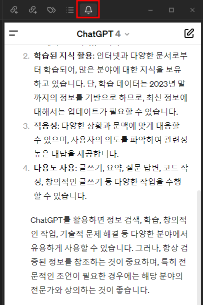 참고로 벨 모양의 아이콘을 클릭하면 ChatGPT 화면을 끌 수 있습니다. 아이콘 모양은 위에서 설명드릴 것처럼 선택하실 수 있습니다.
