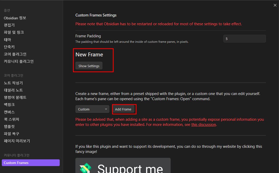 옵시디언에는 플러그인이라는 옵시디언 기능을 확장하고 사용자 개인의 작업을 원활하게 해주는 다양한 플러그인이 있습니다. 이번에 사용하게 될 플러그인은 Custom Frames라는 플러그인입니다.
