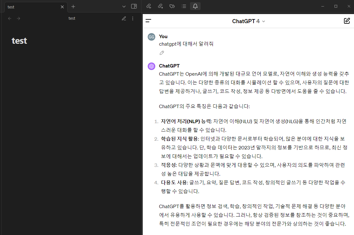 오늘은 ChatGPT를 웹 페이지에 접속할 필요 없이 옵시디언을 사용하면서 바로 검색해 볼 수 있는 플러그인을 설치해 봤습니다. 옵시디언이나 ChatGPT를 자주 사용하시는 분들에게는 큰 도움이 됐을 거라 생각됩니다. 다음에도 유익한 정보로 찾아뵜도록 하겠습니다.