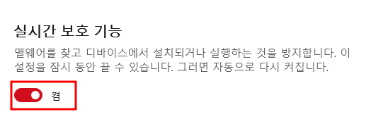 꼭 필요한 작업을 하실 때만 실시간 보호 기능을 비활성화해 주시기 바랍니다.