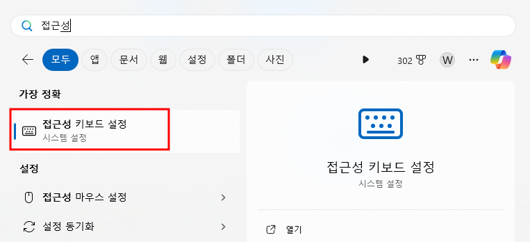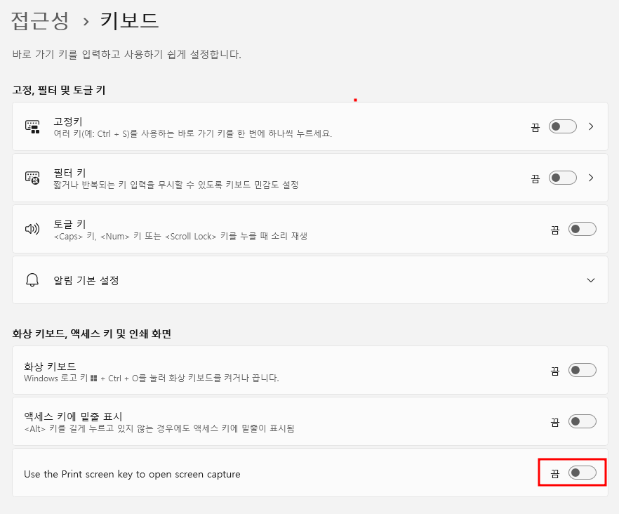 그 후 윈도우 키를 눌러주고 접근성 > 키보드 설정 창으로 진입해 줍니다. 진입하게 되면 아래 Use the Print screen key to open scrren caputre 기능이 활성화가 되어있는 것을 확인하실 수 있는데 이 기능을 끄시기만 하면 됩니다. 이 옵션은 끄게 되면 print Screen(PrtSc) 키를 눌러서 화면 캡처 도구를 바로 열 수 없도록 하는 기능입니다.