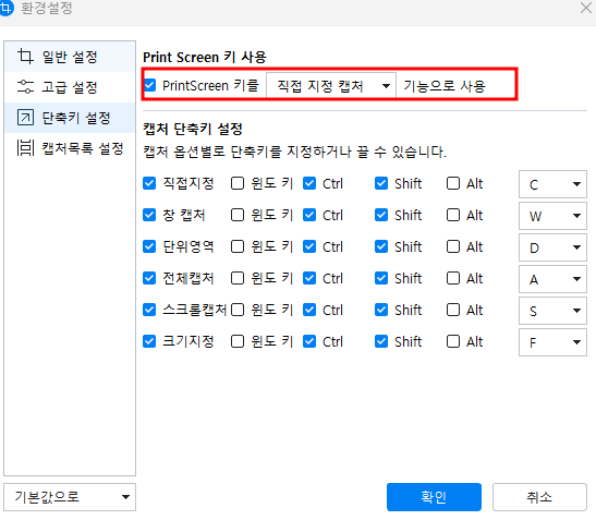 우선 알캡처 프로그램에서 환경설정으로 들어가서 PrintScreen 기능이 활성화되어 있는지 확인해 줍니다.
