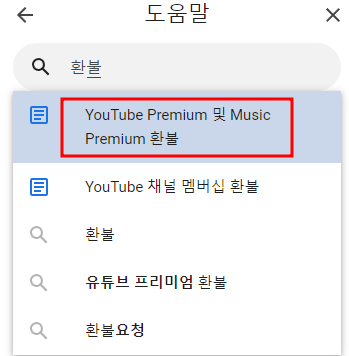 고객센터 버튼을 클릭하셨다면 이제 도움말 검색하기에서 환불이라고 입력해 주시면 됩니다. 환불이라고 검색을 하시면 YouTube Premium 및 Music Premium 환불이라는 문구를 확인하실 수 있는데 클릭해 주세요!