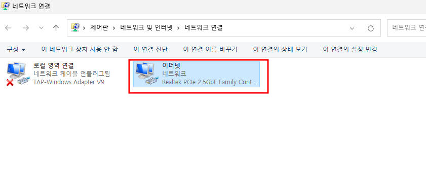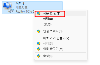 그럼 이제 이더넷이 확인되는데 이 부분을 마우스로 우클릭해 주시고 사용 안 함을 선택해 주시면 됩니다.