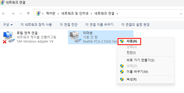 인터넷 연결을 해제하고 작업을 마무리했다면 이제 다시 인터넷을 활성화해줘야 합니다. 그럼 다시 이더넷 아이콘에서 우클릭해 주시고 사용을 클릭해 주시면 다시 활성화가 되는 것을 확인하실 수 있습니다.