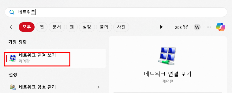 먼저 윈도우 키를 누르고 네트워크라고 입력하시면 아래 네트워크 연결 보기라는 것이 확인됩니다. 이 것을 클릭해 주세요.