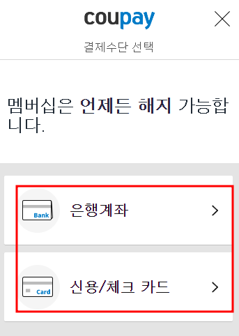 주의하실 점은 로그인을 완료하시면 쿠페이 결제수단을 선택하라고 합니다. 이때 일단 결제수단을 등록해 주세요. 결제수단을 등록하는 이유는 쿠팡 플레이를 무료이용을 하시다 30일이 지나면 자동결제가 되는데 자동결제를 하기 위한 결제 수단입니다.