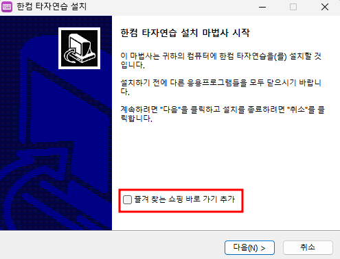 설치파일을 실행하면 한컴 타자연습 설치 마법사가 시작됩니다. 이때 주의할 점은 즐겨 찾는 쇼핑 바로가기 추가 체크 표시를 해제해 주시고 다음을 눌러주세요