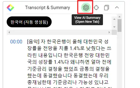확장 프로그램을 추가하고 유튜브 시청을 하시면 오른쪽에 Transcript & Summary라는 창이 하나 더 생깁니다. 이 창을 클릭하시면 자막으로 된 문구들을 확인하실 수 있습니다.