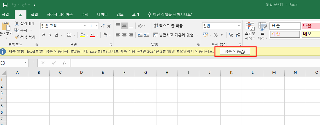 설치가 완료되고 엑셀을 시작하게 되면 정품 인증이 필요하다는 팝업이 나옵니다. 이제 정품 인증 하는 방법에 대해서 알아보도록 하겠습니다.